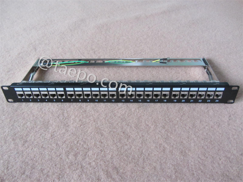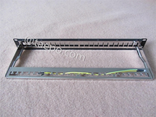 A 19-inch 1U 24-port CAT6A RJ45 STP shielded network server rack patch panel with cable manager and keystone is a piece of equipment used in networking setups to organize and manage network connections.