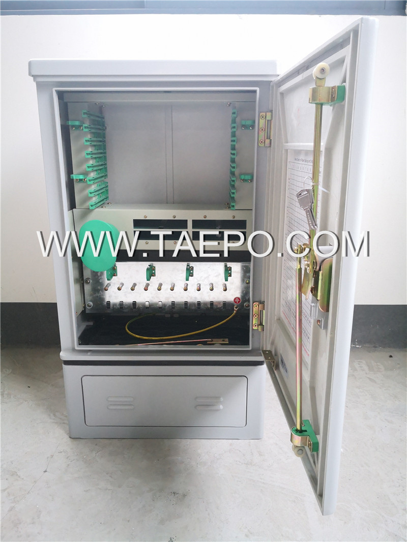 Outdoor SMC fiber cabinet (TP-3401-96S4) is used for the cross connection and terminations between trunk cable and the distribution cables, with provision for fiber splitter. It is also called Optical Cross Connection Cabinet (OCCC) or Fiber Distribution Cabinet (FDC). It is used for outdoor environment. The cabinet consists of the body and the base, made of fiber glass reinforced polyester (SMC).